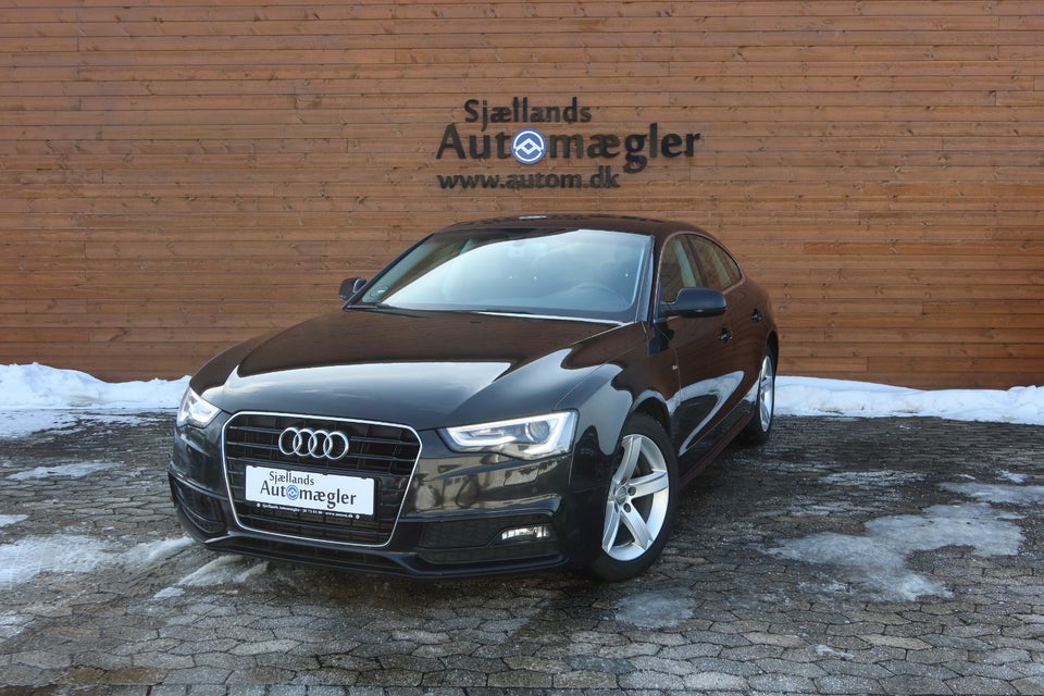 Nu sælges en flot sort Audi A5 Sportback S-line med den stærke og økonomiske 1,8 TFSI motor (144 HK) og komfortabel Multitronic automatgear.